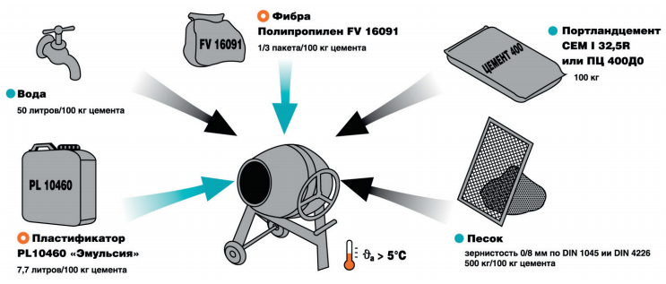 - Перед добавкой в бетон, волокна фибры хорошо размешать в воде до получения однородной массы. Система должна быть защищена от замерзания. Примите соответствующие меры для предотвращения воздействия мороза и сквозняков на этапе твердения.