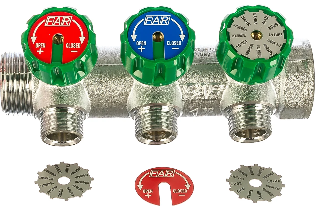Коллектор FAR со встроенными регулирующими вентилями устанавливается в систему отопления или водоснабжения. Коллектор оснащен двухсторонним диском (красно/синий) и диском с обозначениями сантехнических точек (туалет, стиральная машина, раковина и т.д.). С помощью регулирующих ручек можно оперативно закрыть/открыть поток и точно регулировать расход по каждому потребителю. Надежность работы клапана обеспечивается EPDM-уплотнениями. Латунный коллектор FAR имеет хромированное покрытие, которое увеличивает стойкость к коррозии и минимизирует воздействия внешней среды.