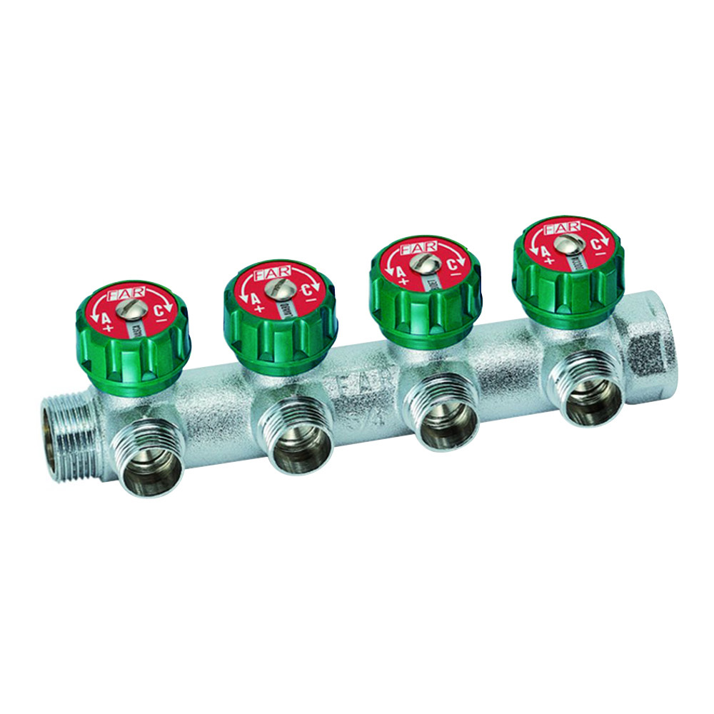 Коллектор FAR предназначен для точной гидравлической увязки и регулирования расхода в отдельных контурах систем отопления (например, "теплого пола") или водоснабжения. Он имеет присоединительный размер 1 дюйм с внутренней (ВР) и наружной (НР) резьбой и оснащен специальной вставкой под плоское уплотнение, что обеспечивает надежное и герметичное разъемное соединение без использования дополнительных уплотнительных материалов. На каждом отводе коллектора установлены регулирующие вентили с возможностью установки электротермических головок для автоматизации процесса. Изготовленный из качественной никелированной латуни, коллектор гарантирует долговечность и безопасность эксплуатации в составе инженерных систем.