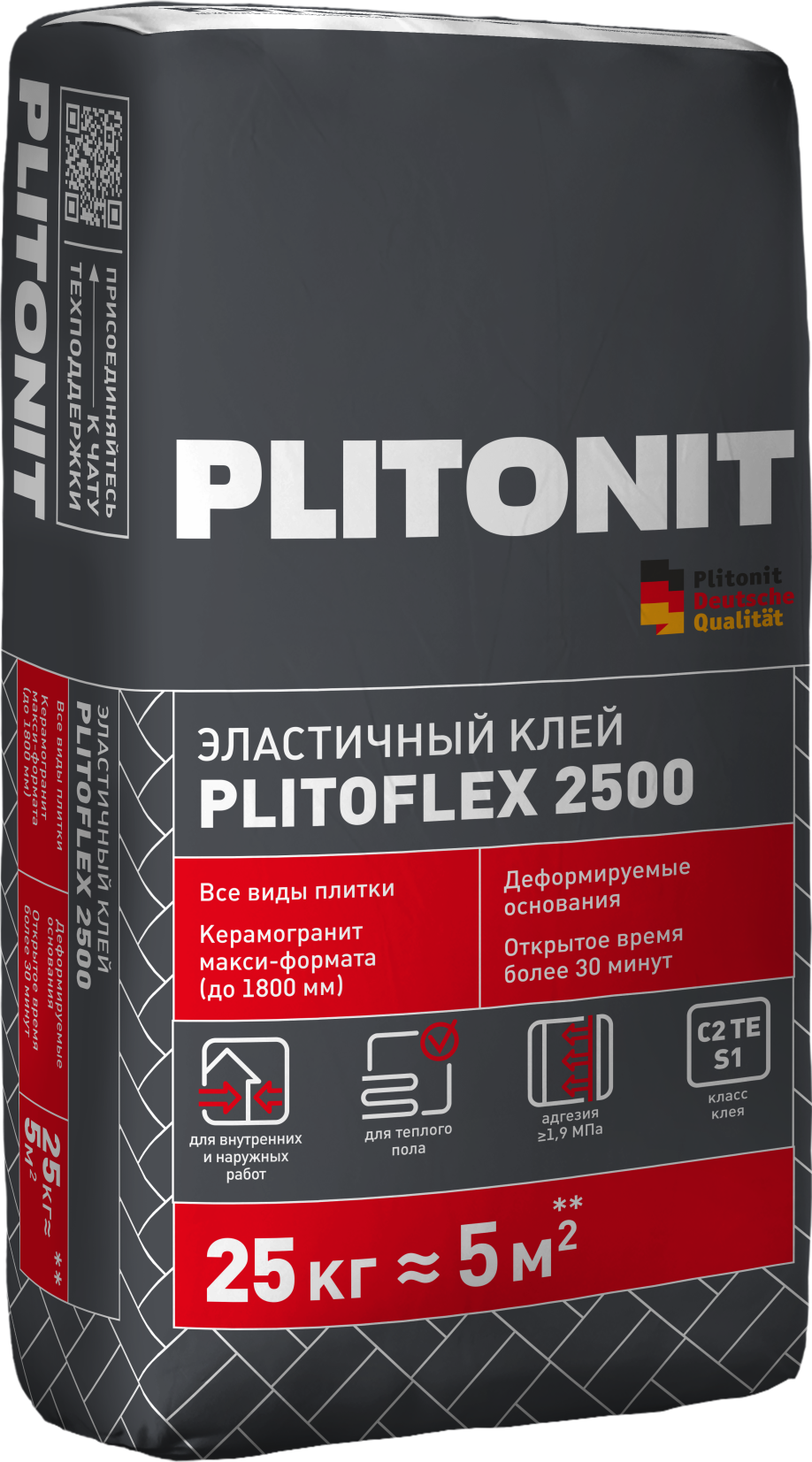 Эластичный клей для всех видов плит. Для крупноформатного керамогранита и облицовки оснований, подверженных структурным и температурным деформациям. C2 TE S1, ГОСТ Р 56387.