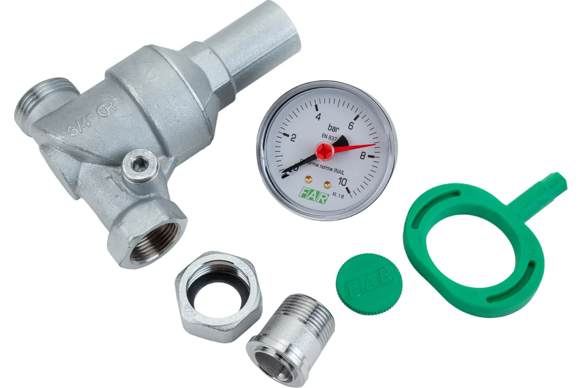 Предохранительное устройство для стабилизирования давления в трубопроводной системе отопления или водоснабжения. Для удобства эксплуатации изделие оснащено манометром.