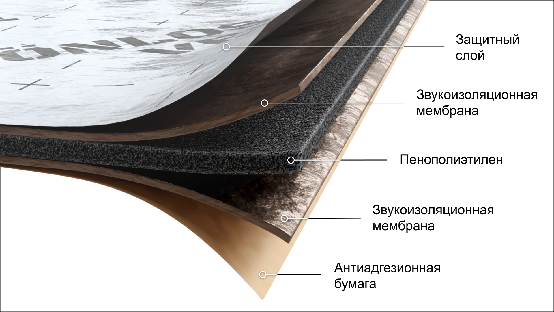 Нижний (монтажный) слой – самоклеящаяся вибродемпфирующая мембрана. Он предотвращает распространение звука по телу воздуховода и препятствует переизлучению шума во внешнюю среду (убирает "звонкость" металла). Наружная отнесенная тяжелая мембрана прекрасно справляется с воздушным шумом. Таким образом материал работает по классической схеме «масса-пружина-масса».